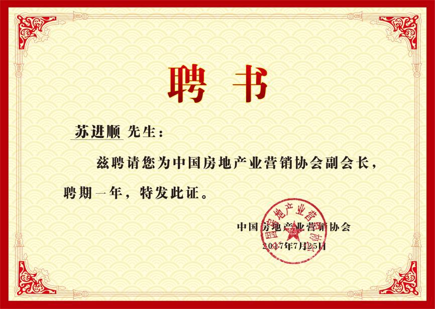 2017725日(rì),經協會領導審核,珠海幸福家網絡科(kē)技股份有限公司成爲中國房地産業營銷協會副會長單位,公司董事長蘇進順被聘爲中國房地産業營銷協會副會長。